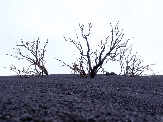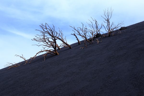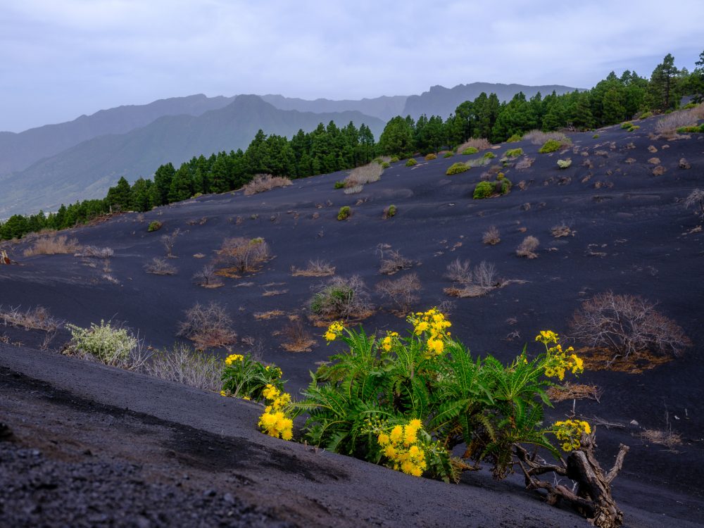 The opening stretch of the trail threads through green pine trees. A strange splash of life against the dark backdrop. Yellow and white flowers push up through the ash here and there. They almost feel like small detonations of color in an otherwise monochrome world. It’s amazing contrast (depending on the sunlight). Colors and structures can change any minute. Even little changes in sunlight have an impact on the vibrant colors. As a matter of fact, the black ash can seem pitch black one minute and then shimmer in a darkish blue the next.
